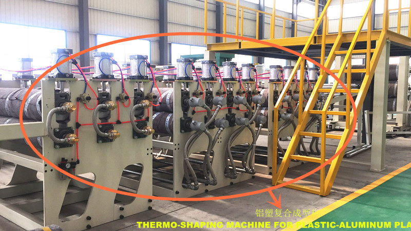 青岛东方之星的一套完整的PE铝塑板生产线由SJ150×33单螺杆挤出机、复合模头、三辊压光机、双面铝卷放料架、双辊热复合机、八辊热复合机、六辊冷却导辊架、覆膜机、四辊牵引机和切割机等设备组成,通过PLC系统实现整线智能化控制。